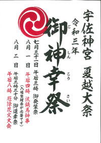 例年斎行しております「宇佐神宮御神幸祭」につきまして、本年は新型コロナウイルス感染拡大予防のため、下記の通り、恒例の祭典の一部を変更して斎行仕致します。ご理解の程宜しくお願い致します。